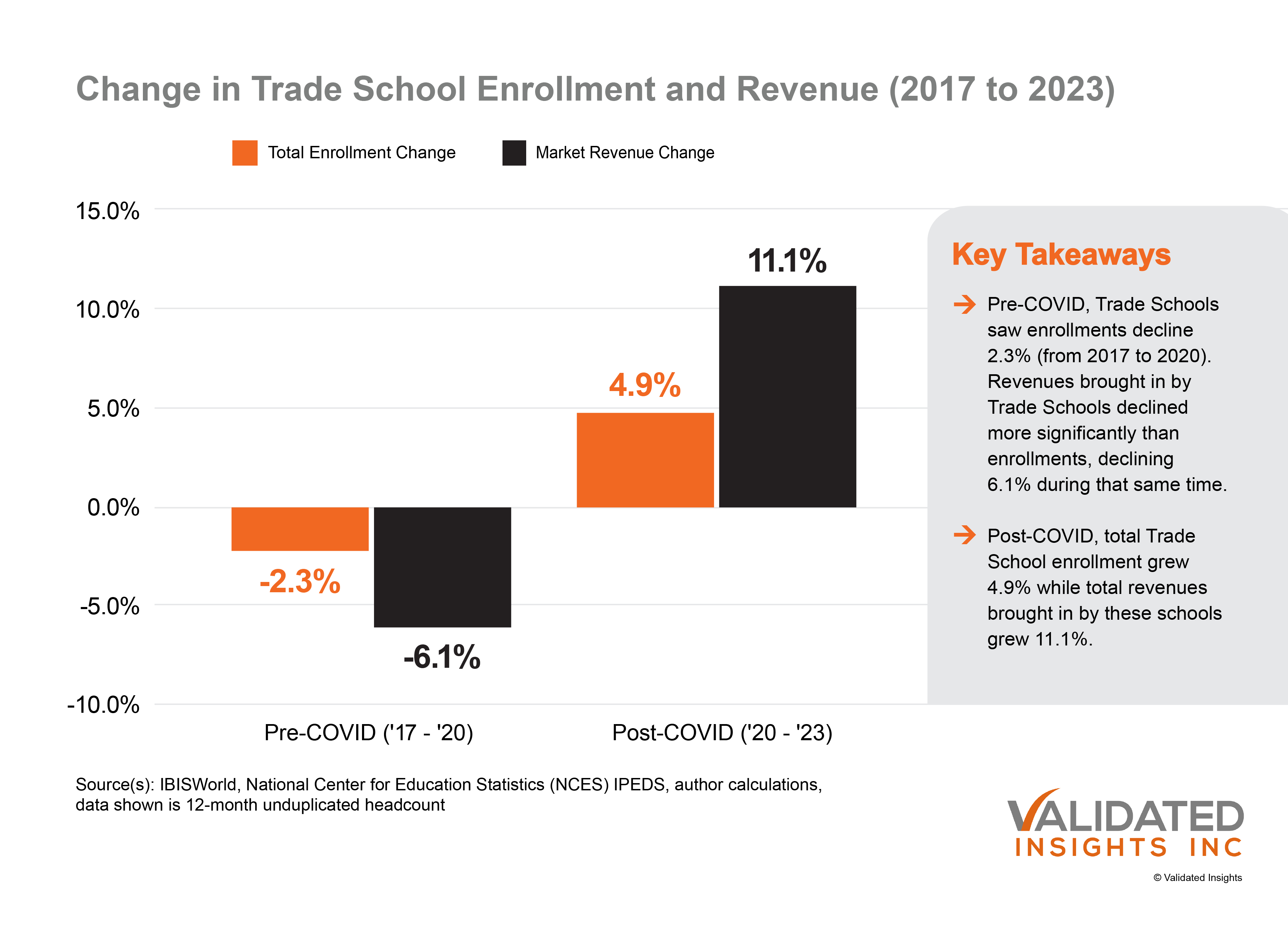 CHICAGO–(BUSINESS WIRE)–A new report released today by Validated Insights, a higher education marketing firm, reveals a significant increase in trade school enrollment following the pandemic, with a 4.9% growth from 2020 to 2023. This surge contrasts sharply with a 0.6% decline in university enrollment during the same period, highlighting a growing preference for career-focused education.