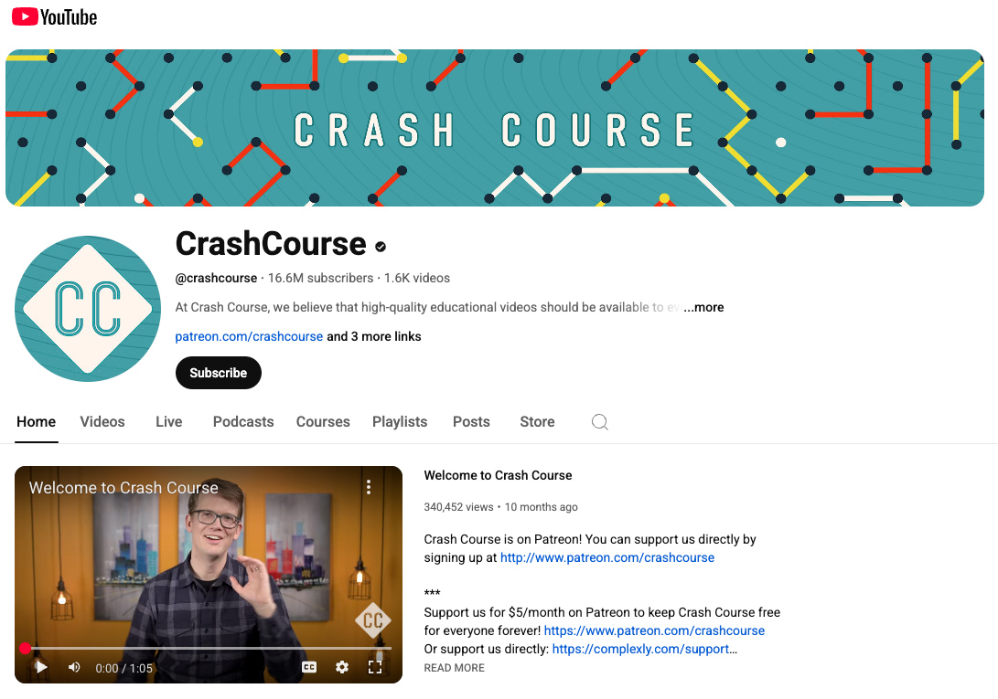 CrashCourse on YouTube — via Matt Tower’s The EdSheet Vol. 18